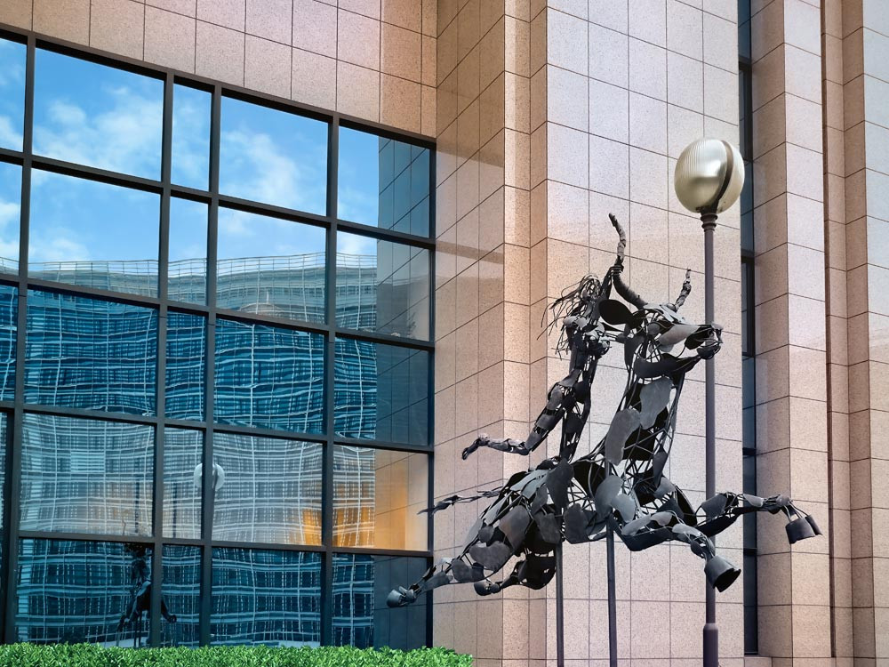 prominent sculpture of a woman riding a bull—the exact imagery of